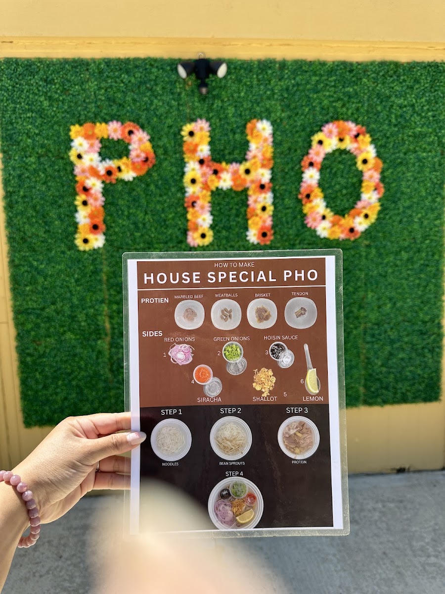 Rice noodles , Meatball Red Onions, Green Onions , Fried Shallots, Bean Sprouts, Lemon, Hoisin Sauce, Sriracha and flavorful beef broth.
