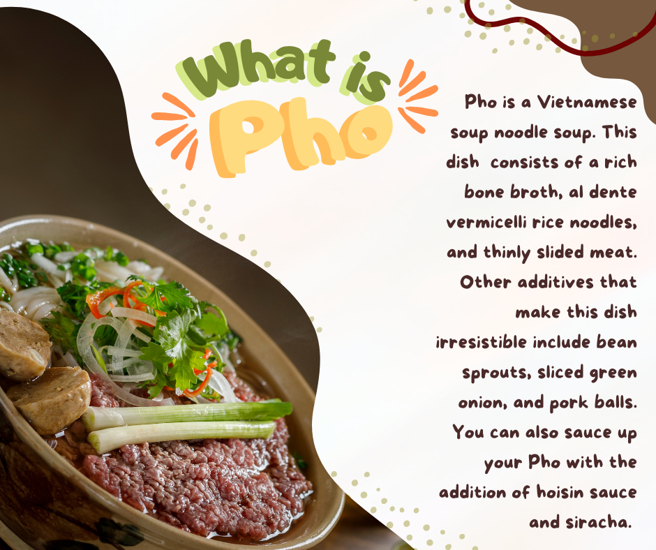 Rice noodles , Steak, Meatball ,Cooked Brisket, Tendon, Red Onions, Green Onions , Fried Shallots, Bean Sprouts, Lemon, Hoisin Sauce, Sriracha and flavorful beef broth.